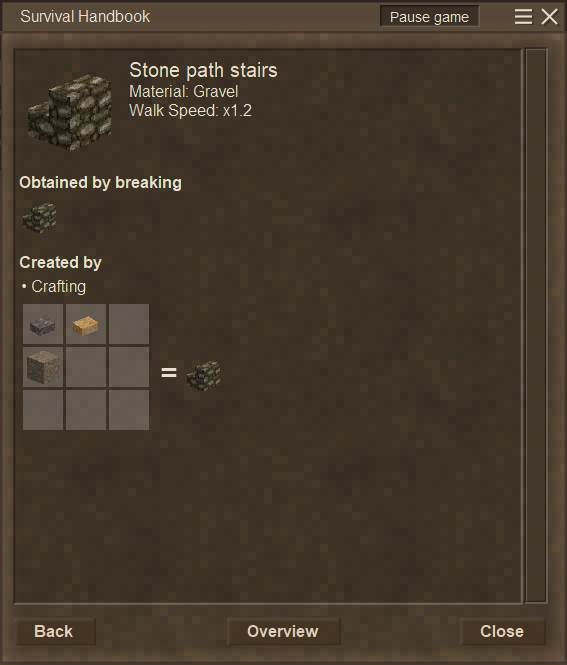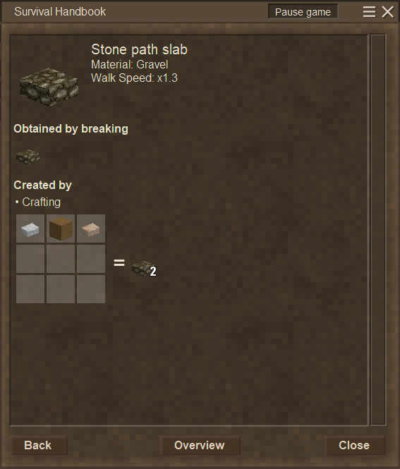Halves the stone cost to make paths, and allows more types of dirt (packed, rammed, cob, seafloor gravel) to be used. Allows two different types of rocks to be used if they're in different stacks.
