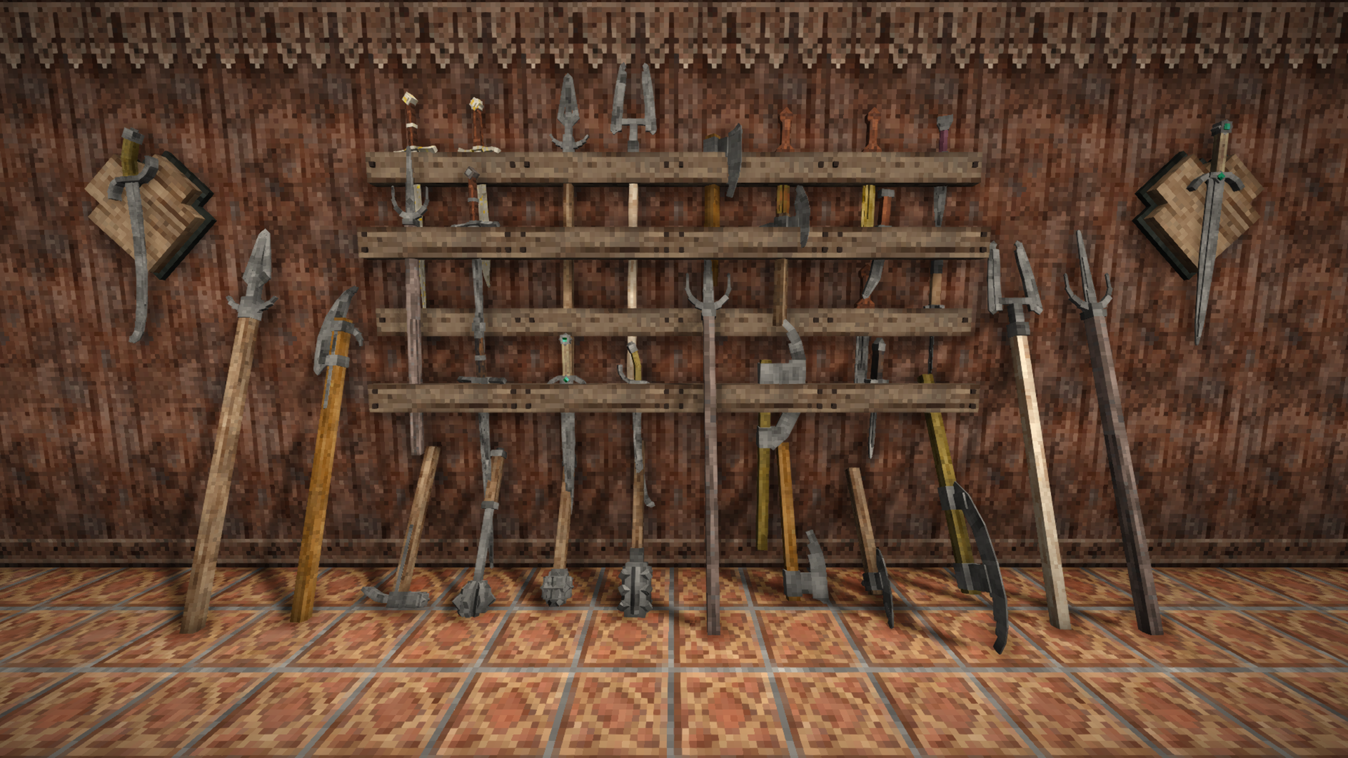 I gave every weapon an animation that was most fitting to its size, I scaled all of them differently compared to LW, to fit the characters hands better, gave the larger weapons such as the claymore, voulge, ranseur etc. an idle animation. (The shovel over shoulder rest). Some of the weapons are restricted by metal types, for example: arming sword, claymore, sabre etc. can only be made in iron and up.