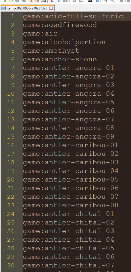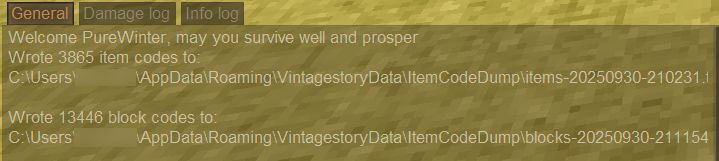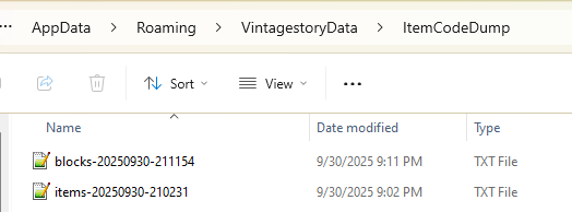 The location of the dumped file output is: AppData\Roaming\VintagestoryData\ItemCodeDump
