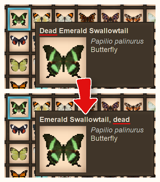 This mod simply renames the dead butterflies and puts the "dead" at the end, so you don't have to always skip the first word when you read the names while you sort through your butterfly collection.