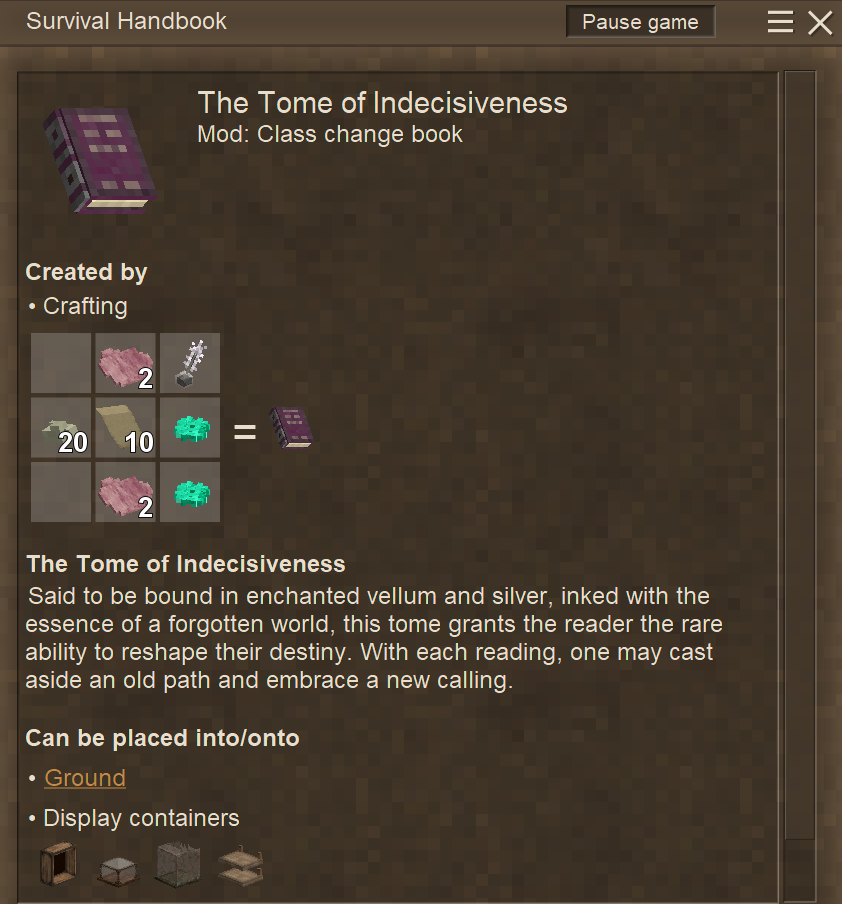 Intended to be used on servers and to allow players to change class autonomously without admin help. I made this mod because we wanted our users in our server to change class without having to need an admin to run the command for them. When consumed, the book basically runs the /player allowcharselonce command for them. The player will then be able to run the .charsel command.