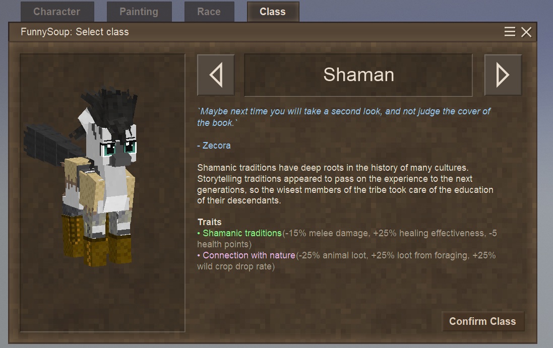 Shaman: Underpowered class with a focus on forage and self-healing, but is very squishy so it's difficult to benefit from this self-healing and generally becomes weaker as the game progresses. Shamans could use more and stronger bonuses.
