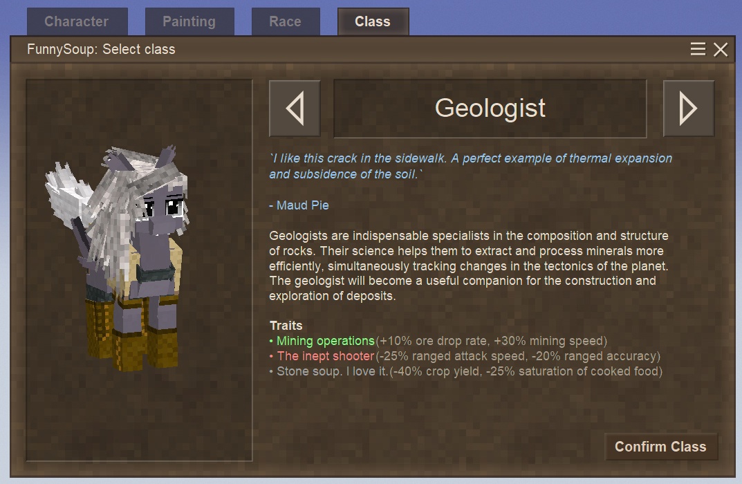 Always love to see more class variety, but I think both the balance and flavor for some classes needs a lot of work currently. e.g. "Blacksmith" is objectively better than "Geologist" in every way except mining speed, so there really is no reason to play as a Geologist; which is also a flavor fail in that "Blacksmith" has it no bonuses to forging (ony mining and charcoal harvesting).