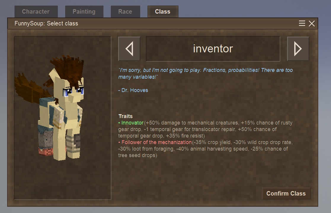Inventor: Strangely this "Inventor" is primarily a combat class vs mechanical enemies, with very situational bonuses elsewhere. Probably the hardest class in the mod to play since it has no generalized bonuses to most of the gameplay loops and severe drawbacks.