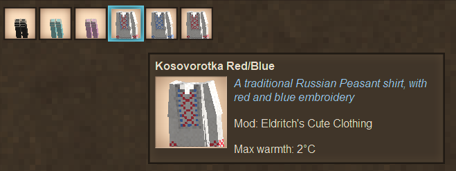 Also, is there any chance to add a max warmth bonus to the clothing? None appear when hovering my mouse over them.