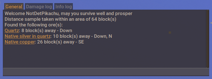 - Distance - Outputs the shortest distance to each ore type found in the area. Available in short, medium and long range variants.