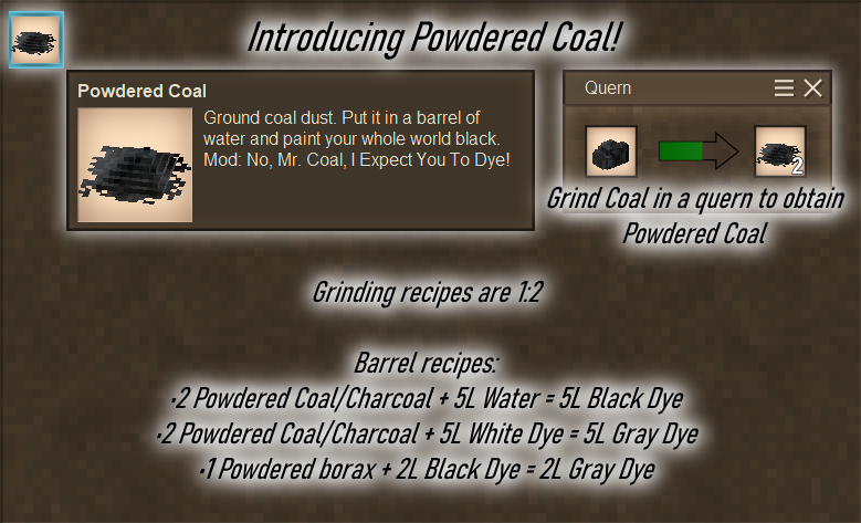 Thanks for all the downloads and nice comments! I've had this game for maybe a week, and I was surprised that a game which has such a focus on realism doesn't have a way to turn coal into black dye. I thought I was happy leaving the mod at "just chuck some coal or charcoal in a barrel and call it good". However, it kept nagging at me that I couldn't figure out how to add quern recipes. So, I started tinkering, as I am wont to do, and here we are; my vision realized. A nice little weekend project.