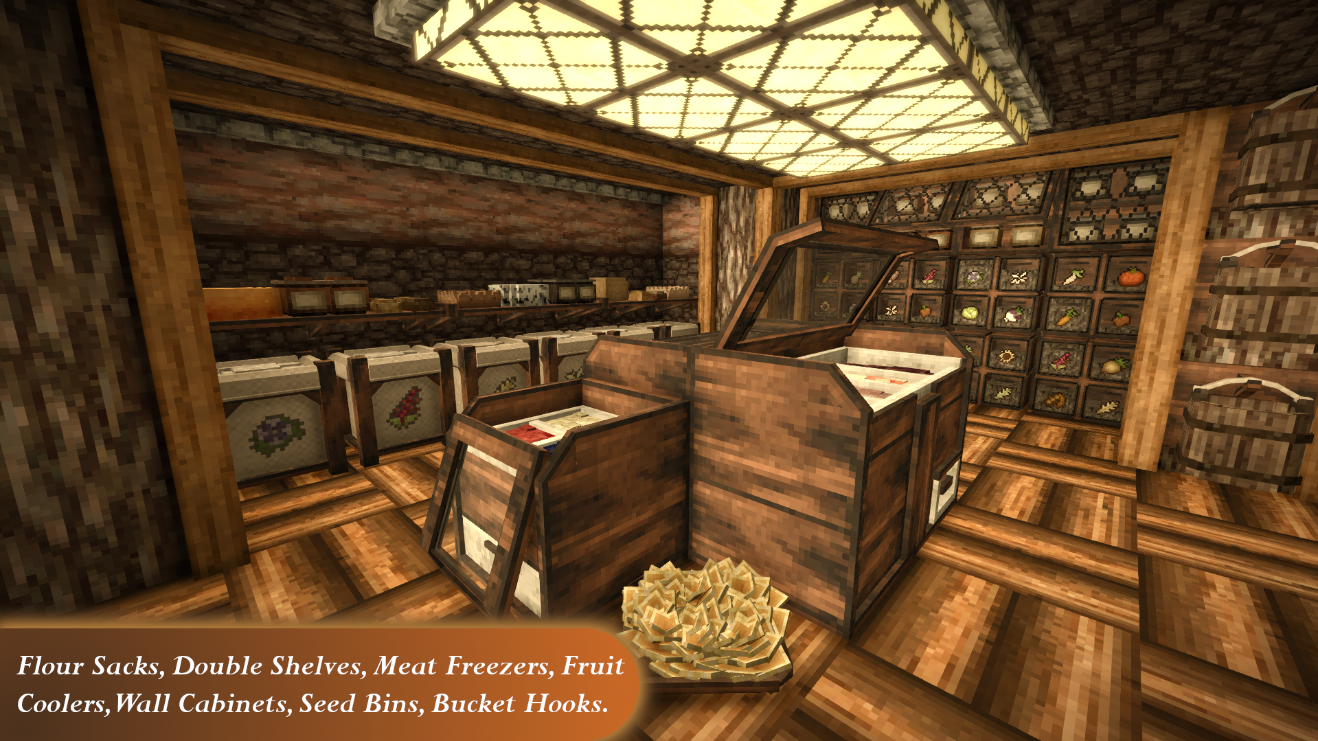 - Specialized containers that keep specific food for longer (like the Ceiling Jar, Flour Sacks or Barrel Racks)