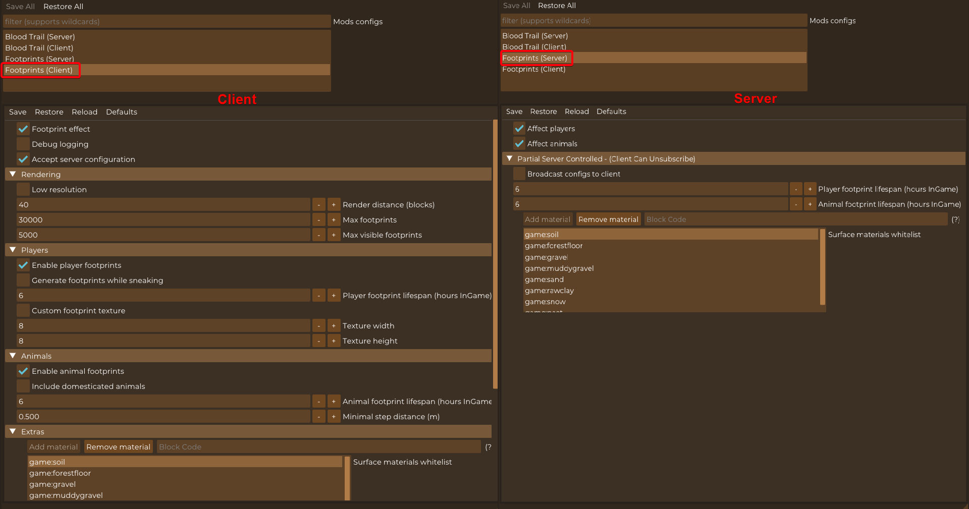 - Server authority: Players and/or Animals footprints are controlled by the server and can be toggle for everyone.