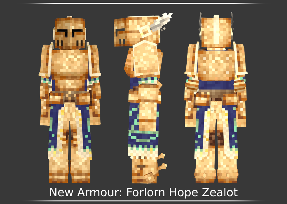 - Forlorn Hope Zealot Armour - A steel-tier set of Forlorn Hope armour once worn by the most fantatical of the oath-bound knights. Crafted by upgrading the existing Forlorn Hope armour.