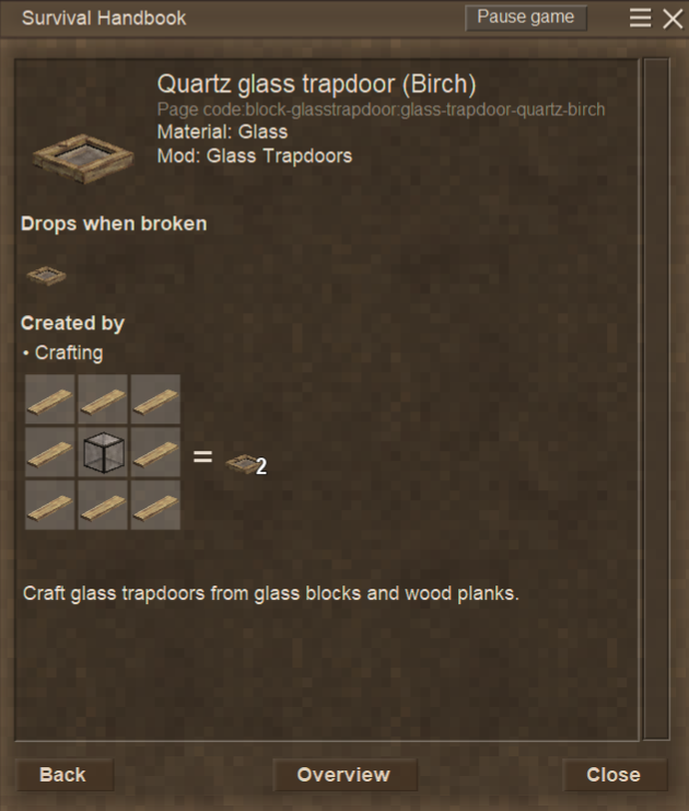 Now you can craft glass trapdoors from glass blocks and wood planks. Or, if you have leaded glass, you can craft leaded glass trapdoors from glass panes and metal bits. The leaded panes are fixed to the orientation of the block, so return the crafted leaded glass trapdoor to the crafting grid to rotate the pane's orientation.