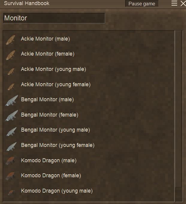 This mod adds 3 monitor lizards to the game, each found in climates akin to their IRL counterparts.