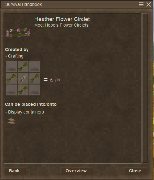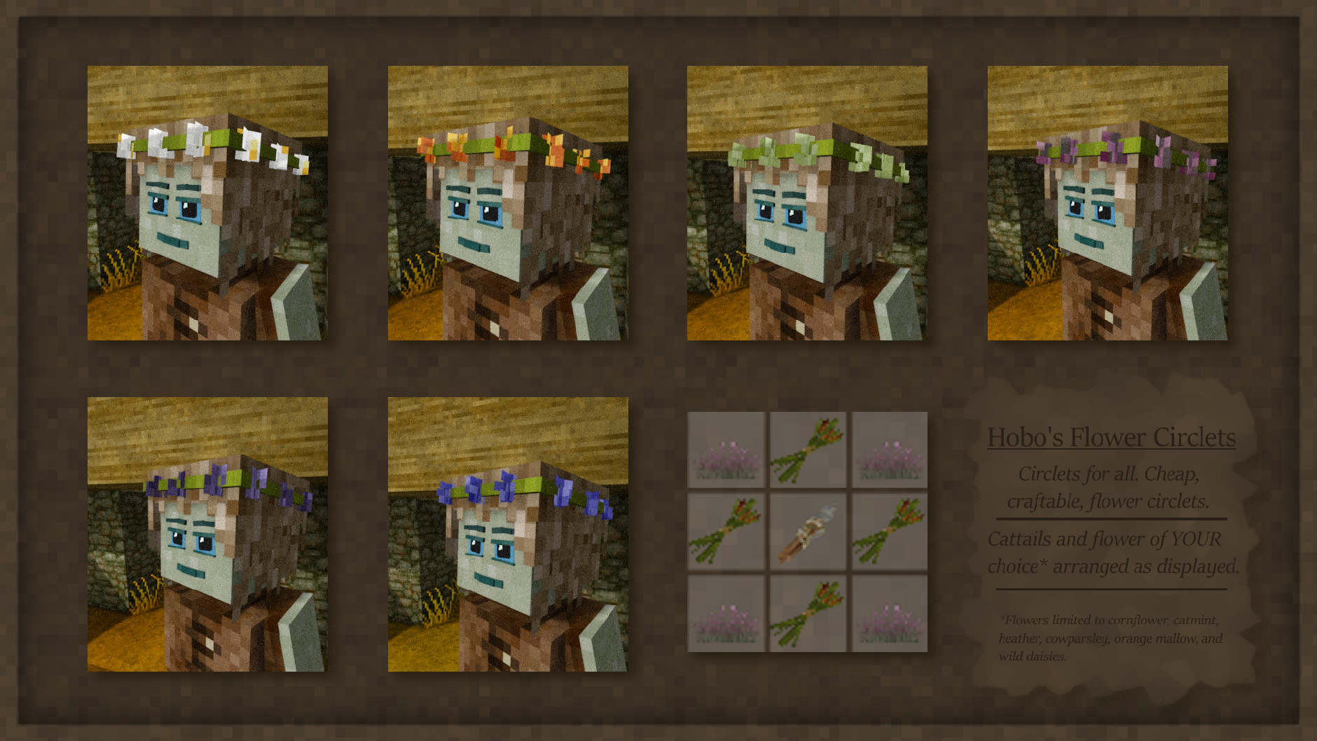 Cheap and craftable, so can be made early game. Doesn't offer anything gameplay wise or make any unwarranted changes, purely cosmetic. If this gains attention I will possibly make more variants available using materials such as copper, silver, gold, and etc. for the band. And certainly more flowers.
