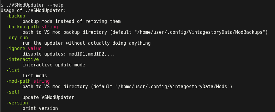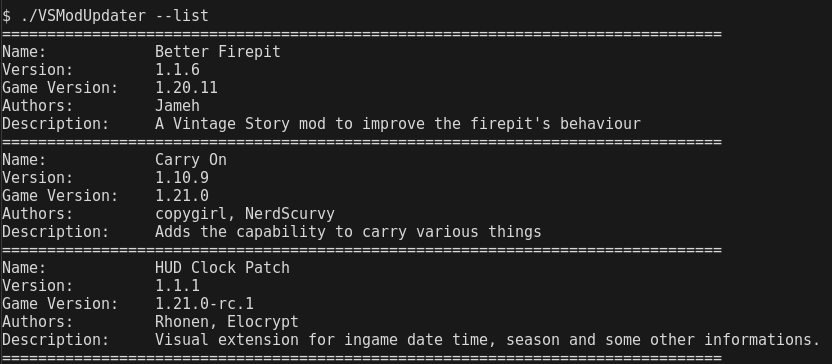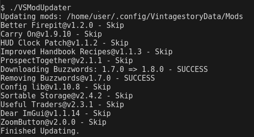 Simply run the program. By default it searches for mods in ~/.config/VintagestoryData/Mods (on Linux) or %APPDATA%/VintagestoryData/Mods (on Windows).
