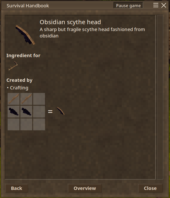- Changed obsidian scythehead recipe to be crafted from two sticks and two knife blades instead of knapped from a single stone