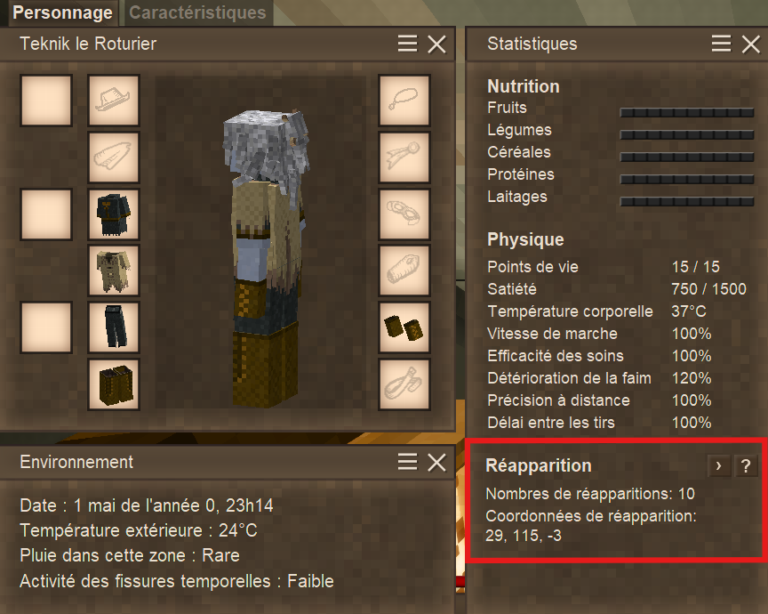 "rpguiinfo": "You can use these commands in chat:\n<strong>/rp</strong> To display the number of respawns\n<strong>.rpwinoff</strong> To disable the display of the `respawn` window\n<strong>.rpwinon</strong> To reactivate the display of the `respawn` window\n\n<font size=18><strong>Spawn point:</strong></font>\n<font size=15>When a player starts a game or joins a server, their character appears at the initial spawn point of the world. Each time the character dies, they will be sent back to respawn around their initial spawn point until they acquire a <a href=\"handbook://item-gear-temporal\">temporal gear </a>. Using this item allows a player to choose any location as their spawn point. Each player in a game must acquire their own time gear, and resetting one player's spawn point does not affect another player's spawn point. A player can reset their spawn point at any time using a new time gear. </font>\r\n\r\n<font size=18><strong>Reset:</strong></font>\r\n<font size=15>Place the time gear in a free slot from your toolbar. With the Time Gear in your right hand, aim at a block and hold the right mouse button to activate the item. During activation, your screen will shake quite dramatically. When the time gear has been consumed, the shaking will stop and your spawn point will have been reset. </font>"