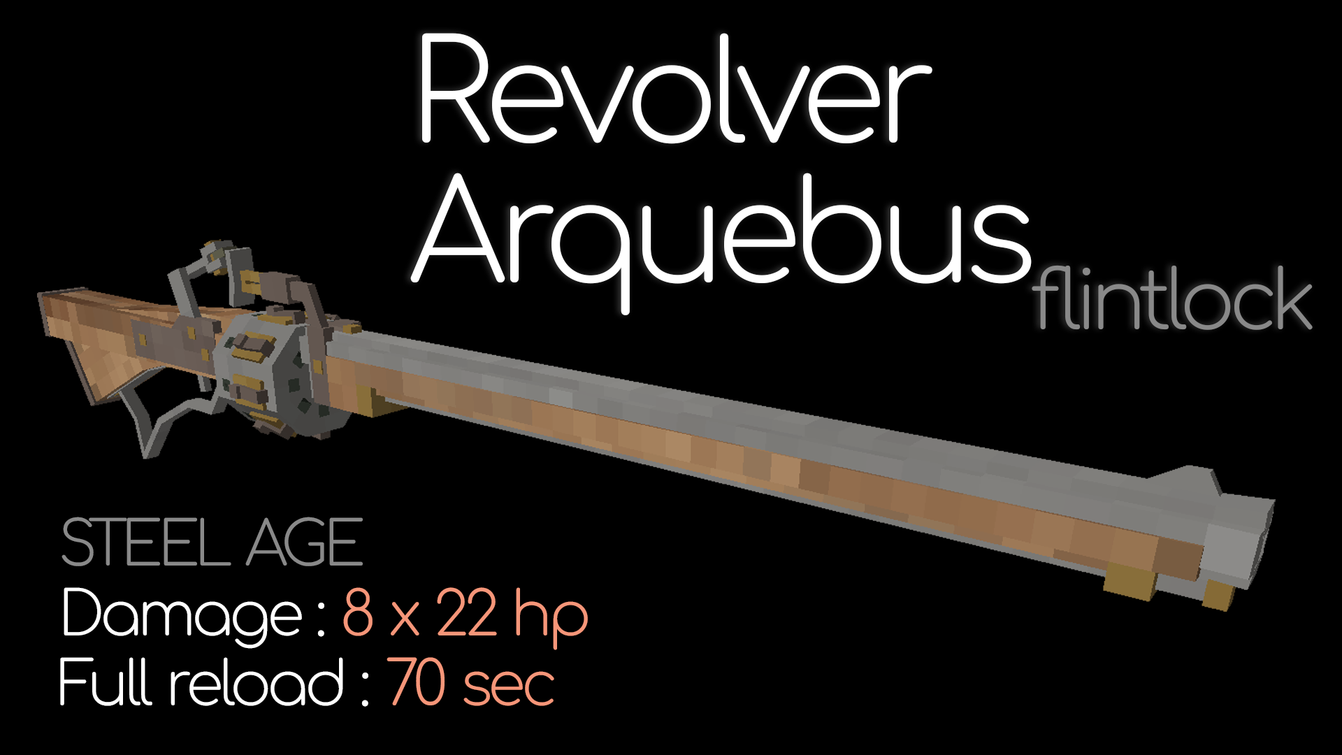 Adds a flintlock revolving arquebus. Requires cupronickel alloy in its crafting recipe. Not as fast to shoot as Bossi carbine, but has bigger capacity and ability to partially reload.
