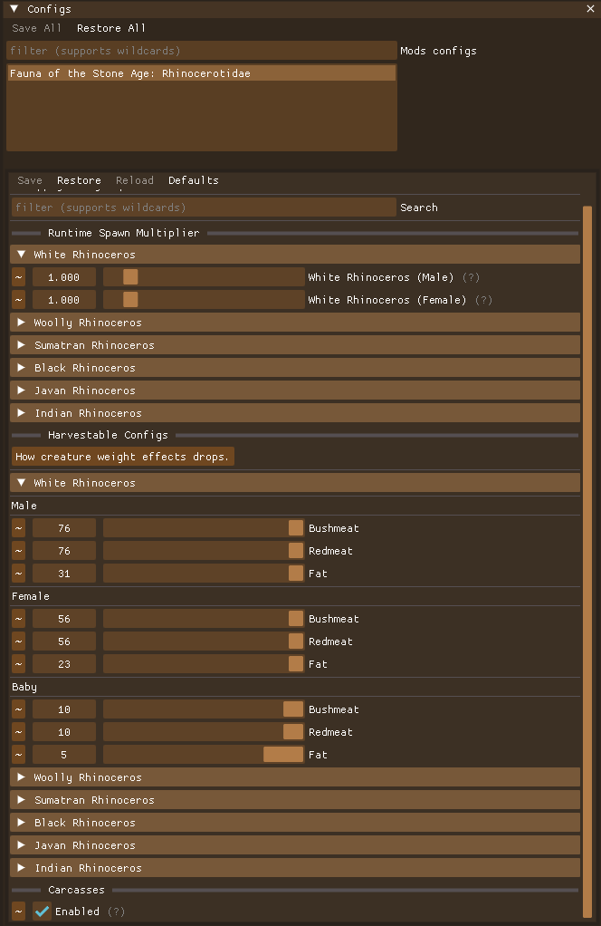 Certainly! So the rhino meat drops is the only one someone wrote a config file for. I've had folks request I make configs for thousands of values in my mods, and at this point I'm only going to add and maintain the ones folks are willing to write themselves as each one not only is time spent to make, but also maintain. If you want to make some config files to include, feel free to send them to me here or on Discord CtrlAltSilent