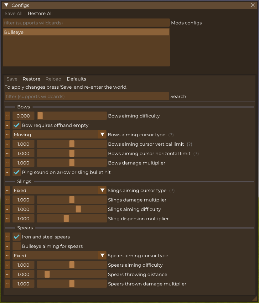 PSA - because of a game bug (https://github.com/anegostudios/VintageStory-Issues/issues/1680), compatibility with other mods doesn't always work. This is true for all mods Bullseye has compatibility with, but Weapons Pack Gamma is affected the most. In singleplayer, you can make the problem go away by exiting your world and loading it again. Sadly for servers, I don't know of a way to do that.