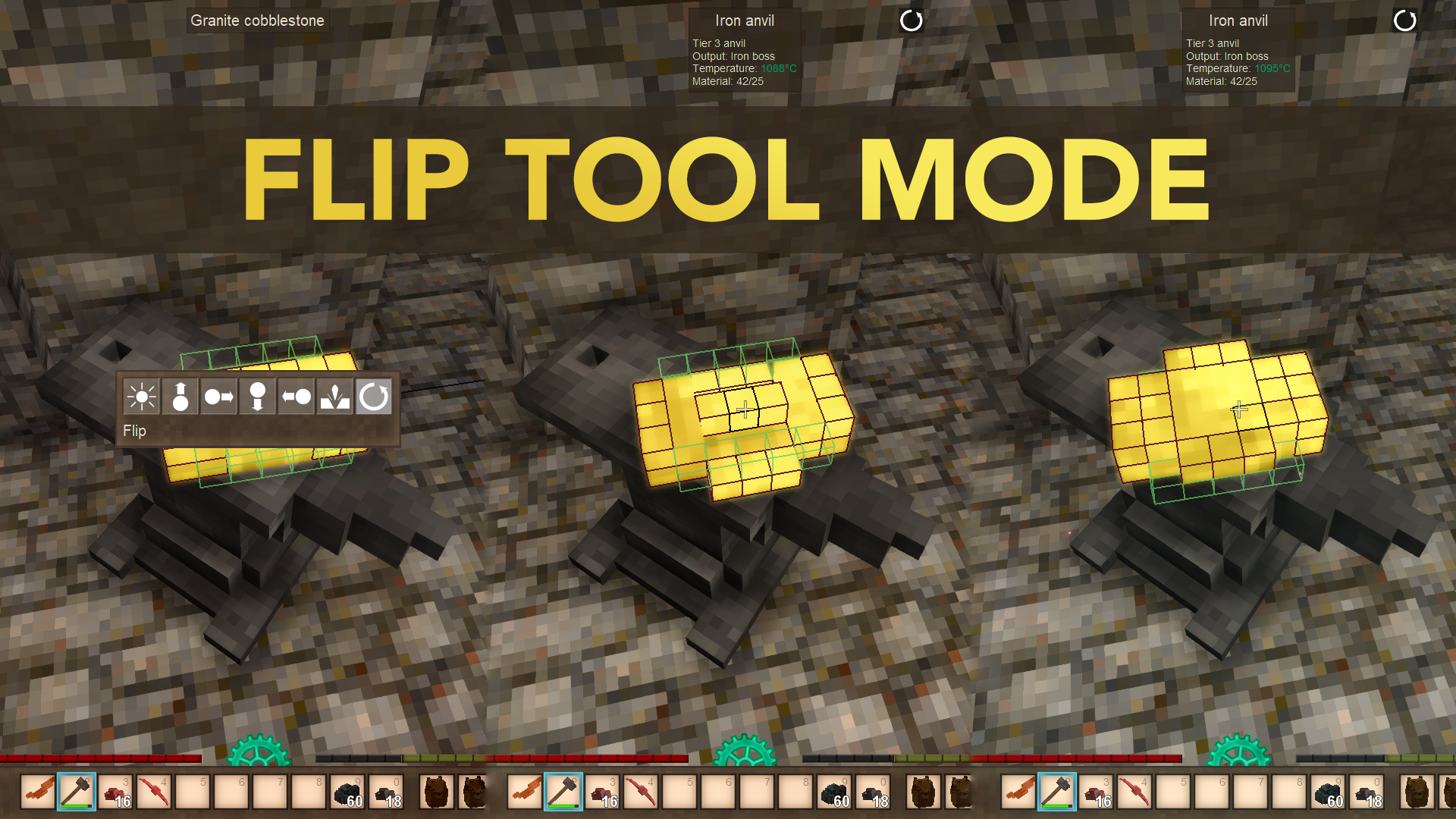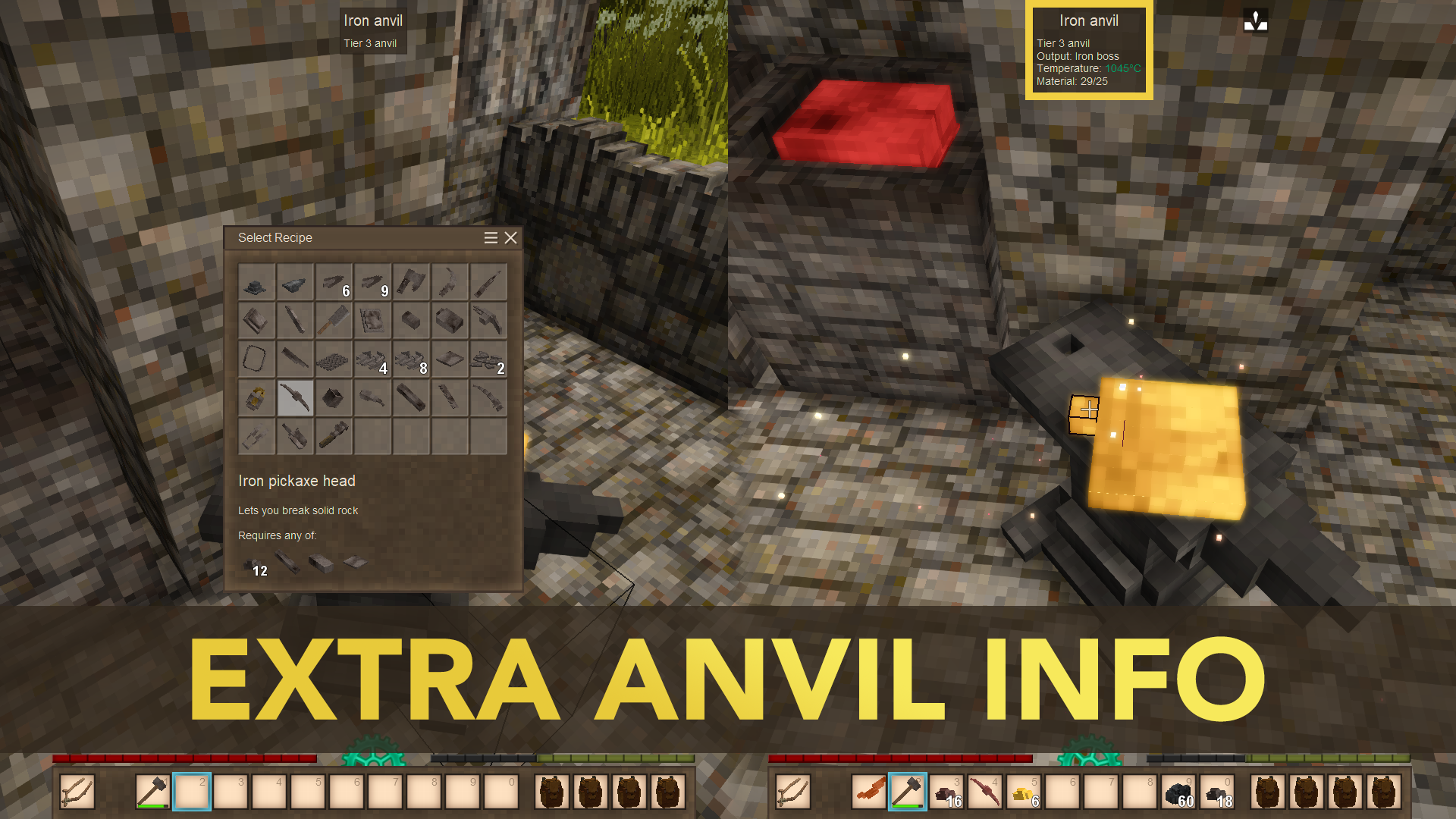 Have you ever messed up when smithing an item? Thought "What if I could just add a few voxels back"? Here's the solution! Add heated metal bits to the anvil directly, or smith with metal bits and native nuggets (copper, gold, silver) using Smithing Plus. More smithing tweaks and QOL to come.