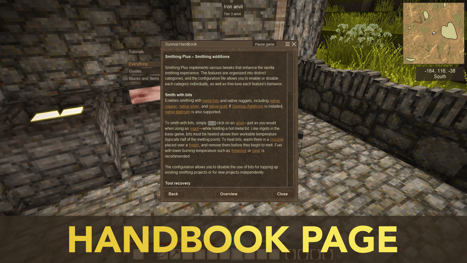- Handbook will display smithing ingredients and the minimum quantity necessary to smith an item