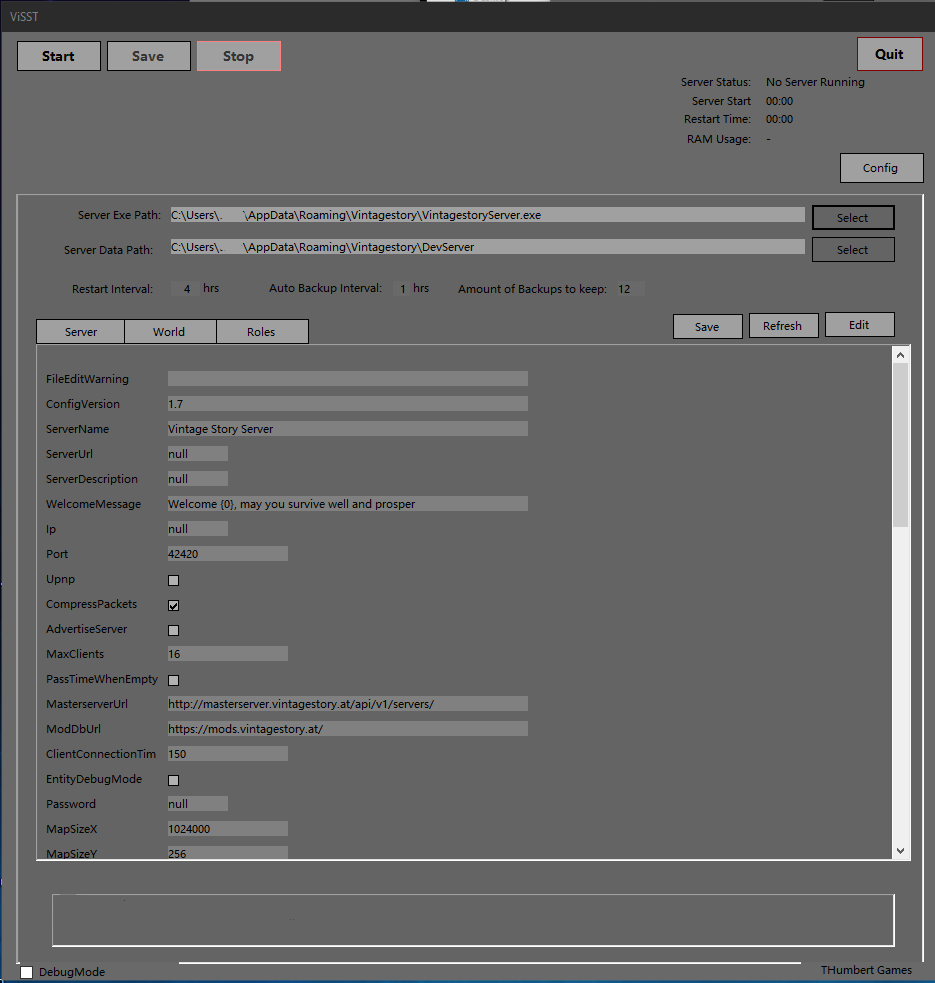 - (Versions 0.2-0.4) During restart ViSST may crash but does not crash the Vintage Story Server. It looks like the fix in 0.5a solved the problem.