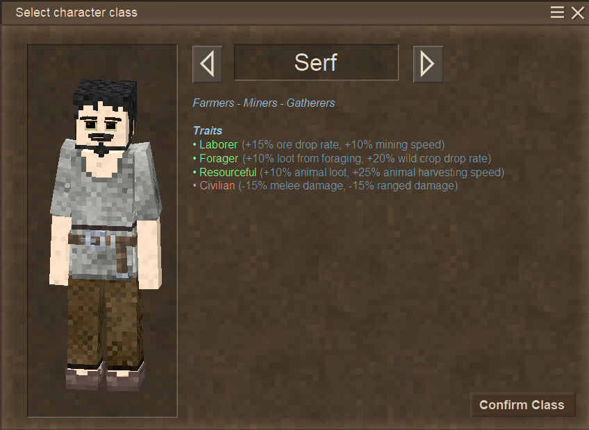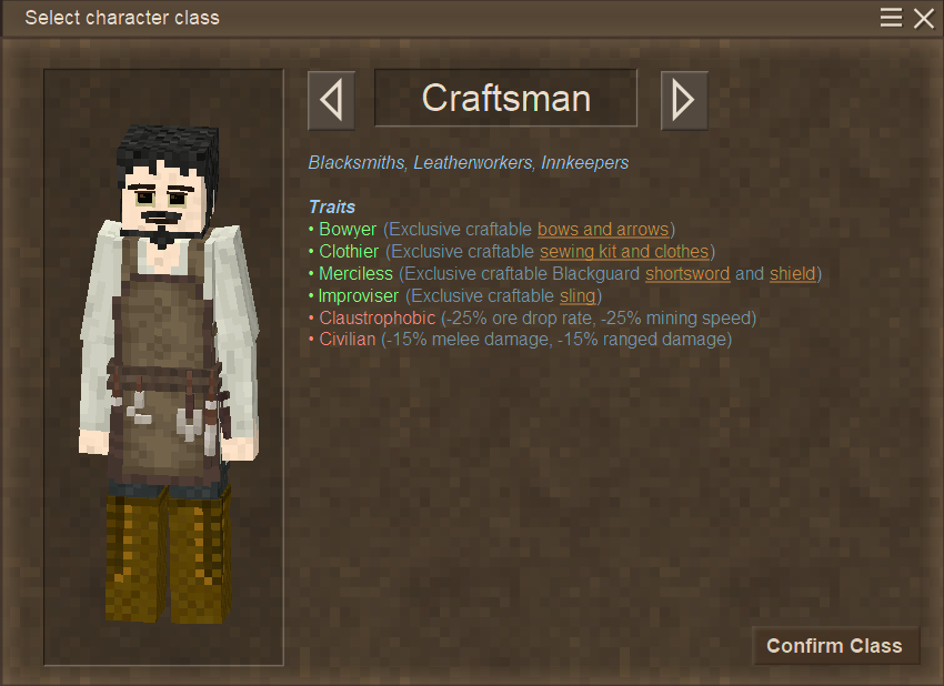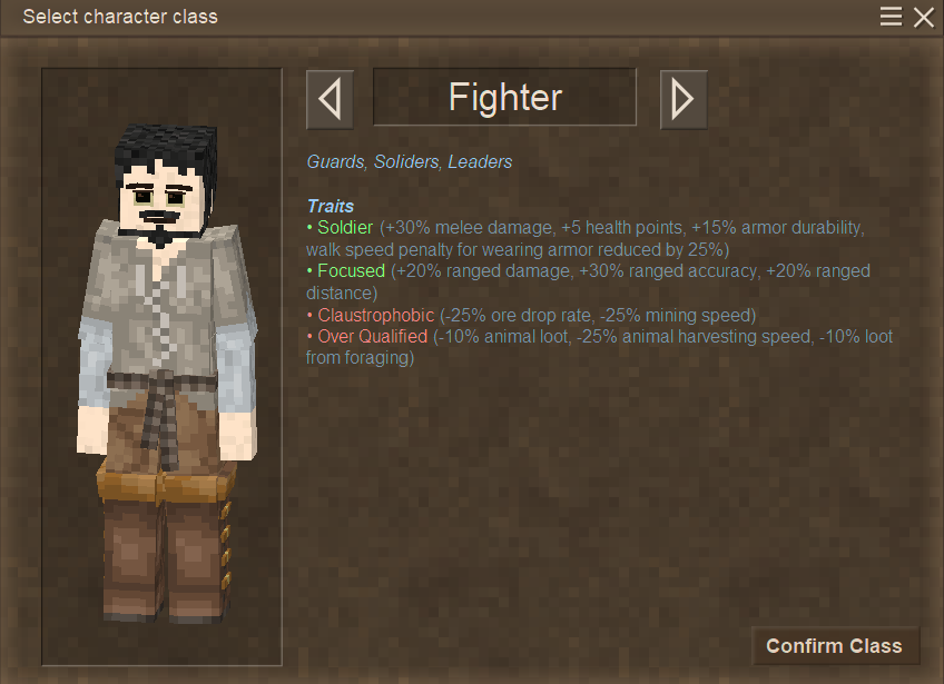 Thank you so much for your input and suggestions. I wanted to use heavy handed for that trait originally, but in the context it being the only combat oriented class, I felt heavy handed or some other variety of careless or untactful wouldn't make sense for a dexterous archer type or a noble with combat training, but over qualified would. There was originally a ranger class, but I opted against it because I believe players are unlikely only specialize in one variety of combat in a real server setting.