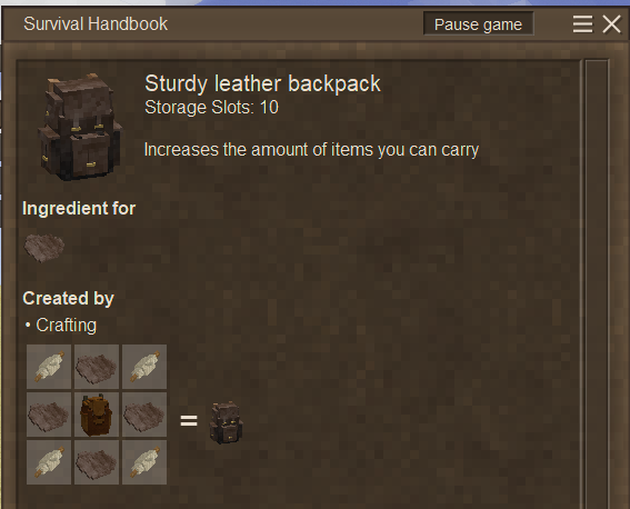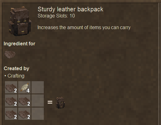 Added a recipe to upgrade the leather backpack to a sturdy leather backpack, also added a flax twine requirement to both the leather and sturdy leather backpacks. Refer to screenshots. | |||||||