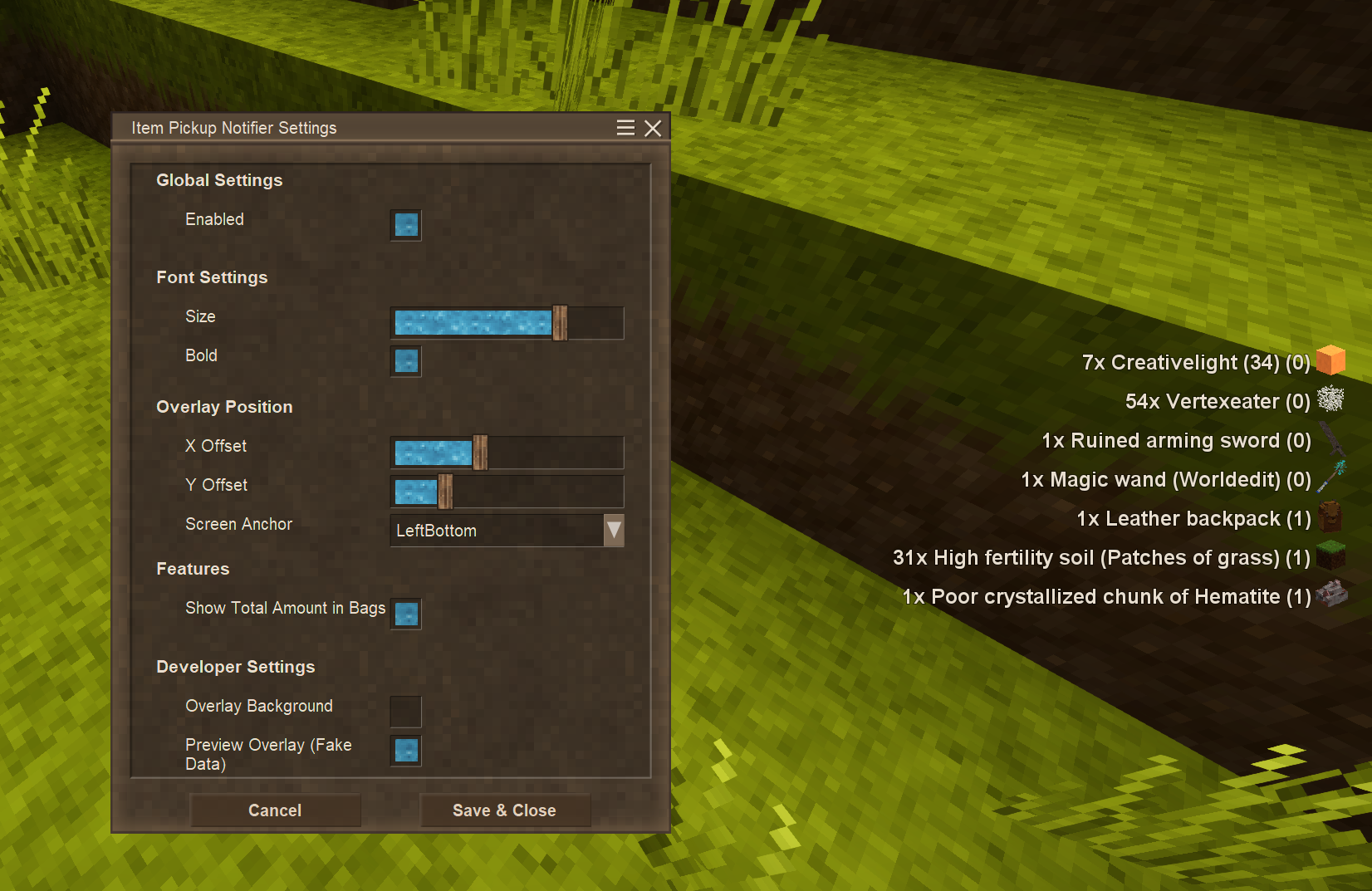 Alternatively you can configure via settings file. After running the mod for the first time the file itempickupnotifier.json should appear on your <VintageStory Data Folder>/ModConfig/.
