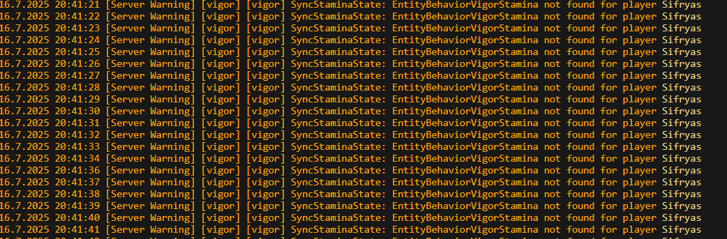 19.11.2025 14:38:54 [Event] [Vigor:API] Consuming 15 stamina on server for player Vintagestory.API.Common.EntityPlayer
