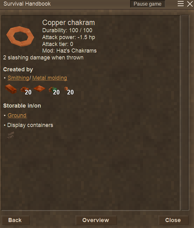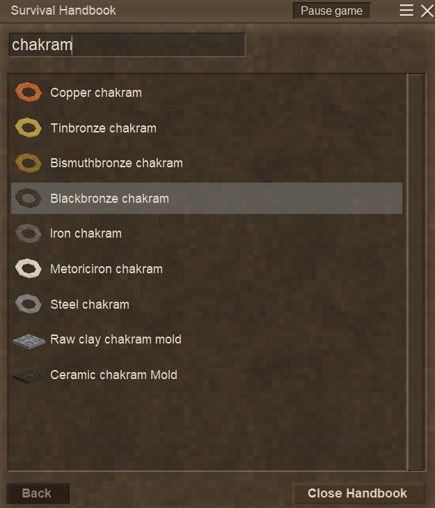 - Chakrams - Metal throwing weapons that can be smithed on an anvil or cast in a ceramic mold.
