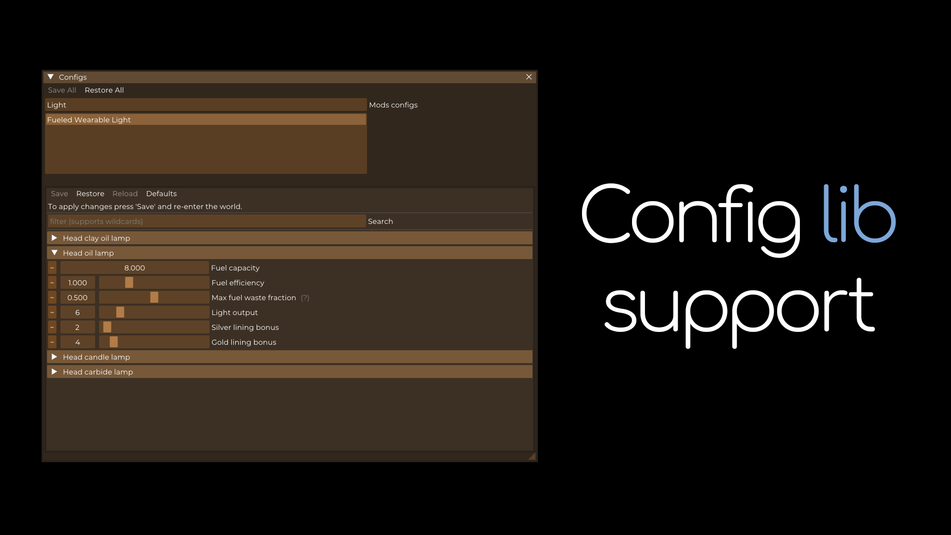 Adds wearable light sources that require fuel to function and can be toggled by hotkey ('L' by default). To refuel, drag fuel item onto the wearable light source item in inventory.