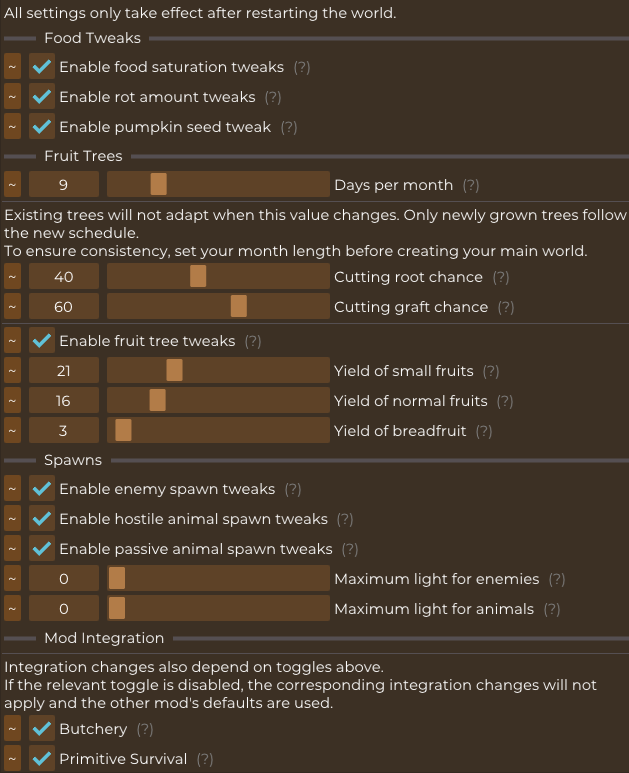 - If another mod changes the same values (e.g., fruit yields, satiety, spawn behavior), the result will simply reflect whichever mod loads last. No crashes or errors should occur.