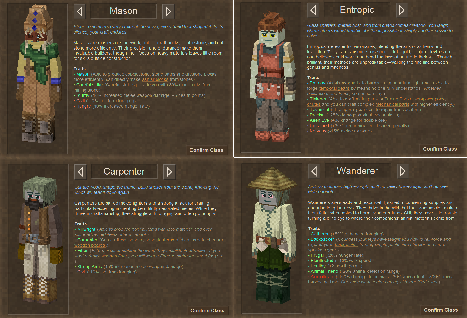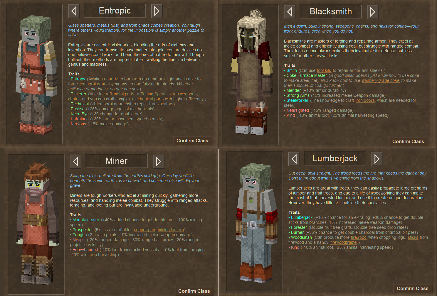 Though I will admit, having both Lumberjack and Carpenter feels a little bit redundant, even though I understand the two are entirely different ends of the production spectrum. I probably would've handed the charcoal bonus to the Blacksmiths and lumped wood gathering into Carpenter myself, but I am not much of a modder (yet, anyways...), so thats just idle musings on my part. That and having one guy doing both logging and charcoal burning is more tidy overall, than splitting it up across classes, I will concede that much.