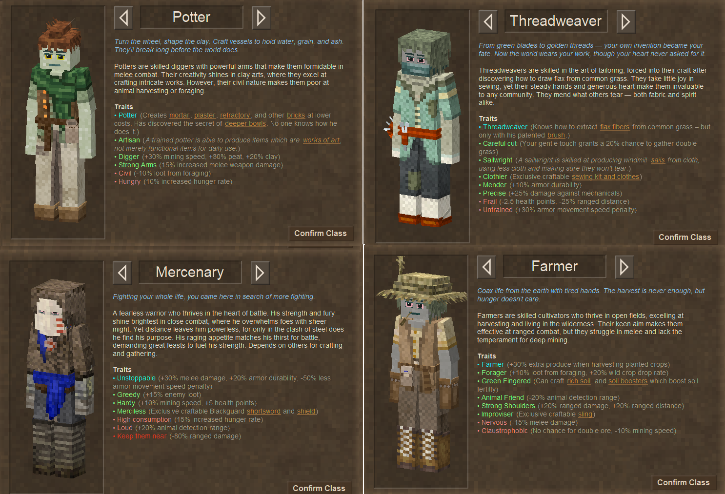 Though in a similiar vein, I feel like Threadweaver (and Tailor) are often kinda overlooked in class mods. In the vanilla game, they are absolutely shafted beyond their ability to make Tailored Gambesons (which are super useful in vanilla gameplay). But sometimes when you weave mods into it, things kinda get bleak... With Combat Overhaul in particular, a mod far from unpopular, Tailored Gambeson isn't even that good because it only offers a slight increase (and more colors) over the non-tailored Gambeson, and still offers the same penalties! Mods like Tailor's Delight and Dressmaker gives the Tailor more things to craft, but beyond having a lot of things locked to them, the Tailor (and derivatives) rarely get anything else to contribute. Rare as it is, I like class mods that give the Tailor a bonus very specifically to growing Flax, or maybe animal products for more hides (even tho that is coupled with getting more meat, which isn't as fitting). But now I am simply rambling about a pet peeve of mine, apologies.