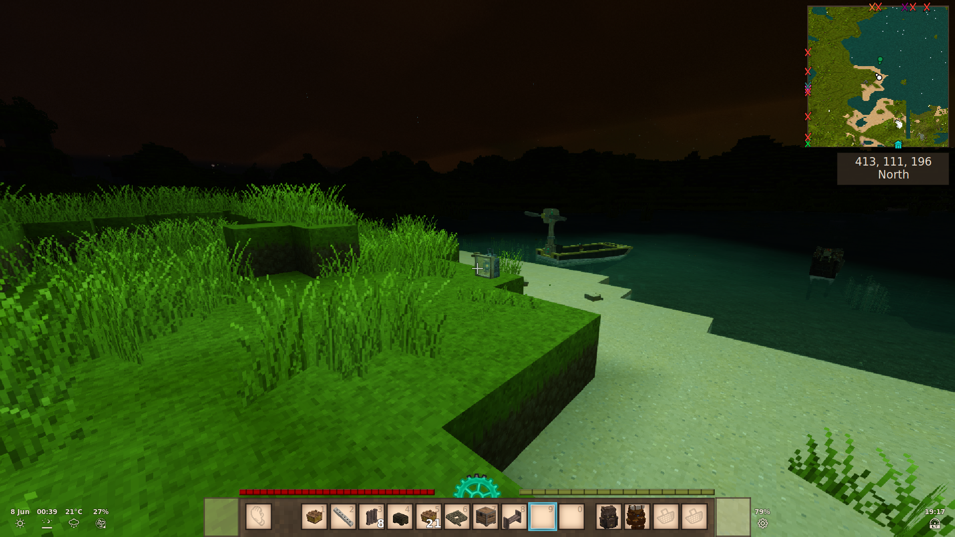 A later-game item designed to have its own niche separate from the canoe, sailboat, or Jonas boat. It's fast, you can carry it in a backpack slot and you can take your elk or a passenger (but not both) with you, at the cost of being more expensive than a canoe and having very limited storage capability compared to a sailboat.