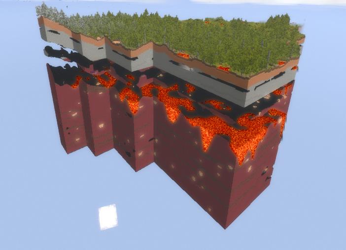 PeachyPotato The mod puts the main Nether cavern at sea-level, and then generally goes up another quarter-ish of the world, depending on rock strata (and down to the mantle). The non-Nether caves above that are also slightly tweaked, and the surface will favor flatlands and mountains. But otherwise the surface and top-level caves are generated like in vanilla, so you can get all the types of woods, reeds, rocks, ores, etc. Story structures may not generate, and right now you'll have lava lakes everywhere until I can figure out how to fix that.