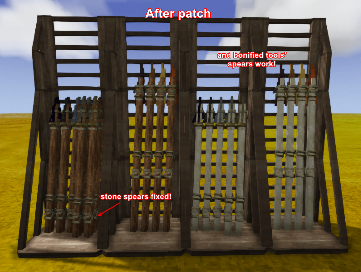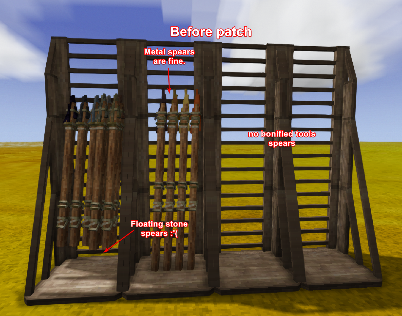 - Stone spears are lowered in the spear rack, to fix them floating.