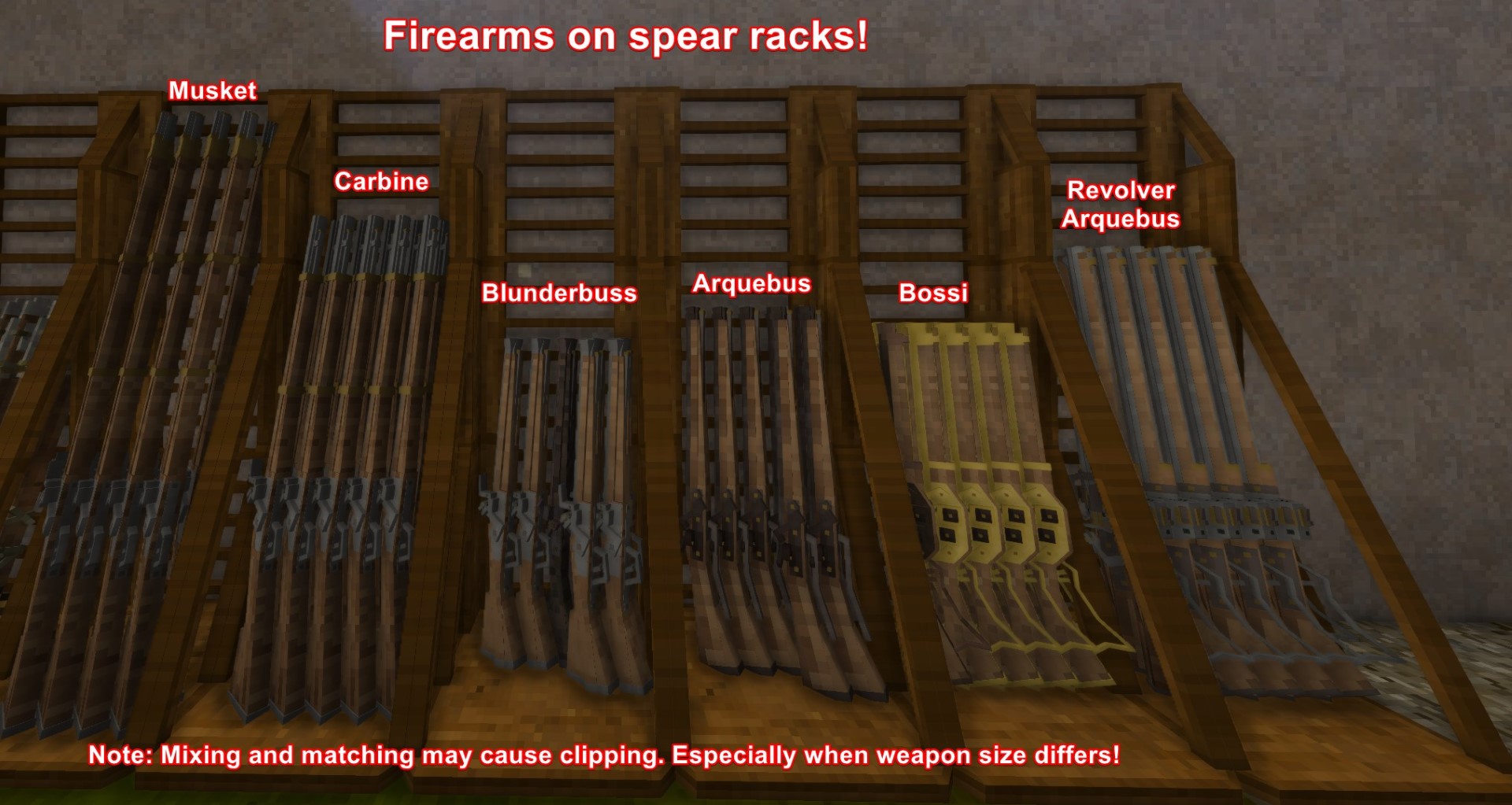 - Firearms on spear racks that are different types may have larger clipping issues when mixing and matching. Preventing this with just a patch mod is very difficult so I probably won't be able to fix this.