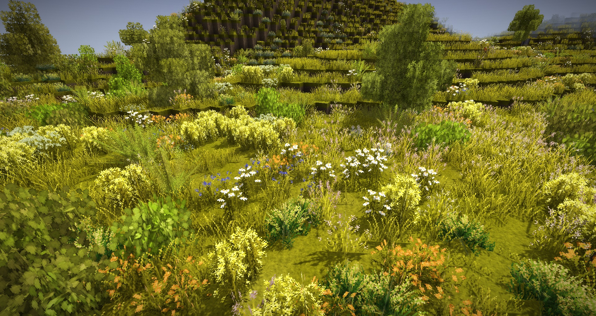 And I think aesthetically it might be a little too busy? Like it spams the patches everywhere, which kind of removes regular grassy fields, which are still a thing in nature. Not everything is pure wildflower madness.
