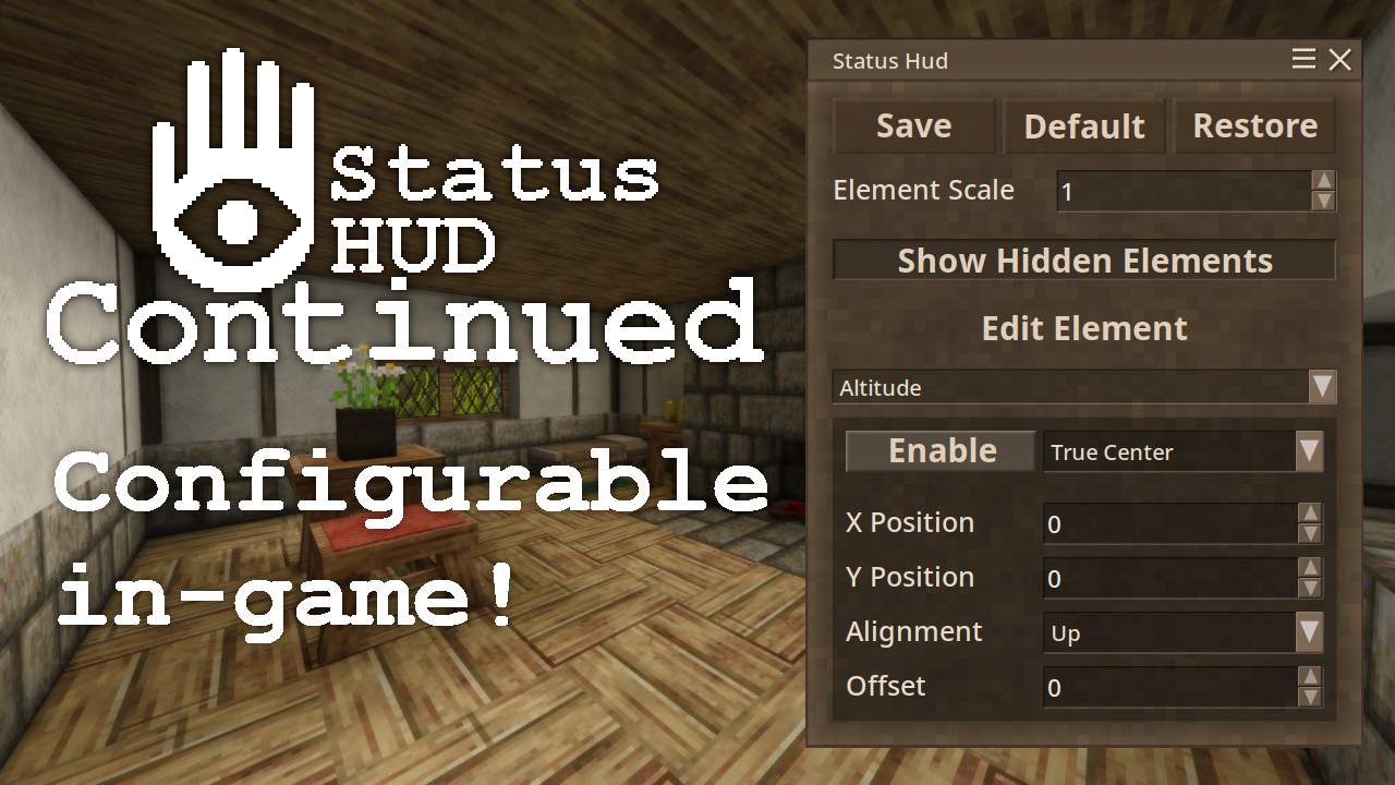 Status HUD Continued offers a collection of various elements to display on the HUD. The available elements are: