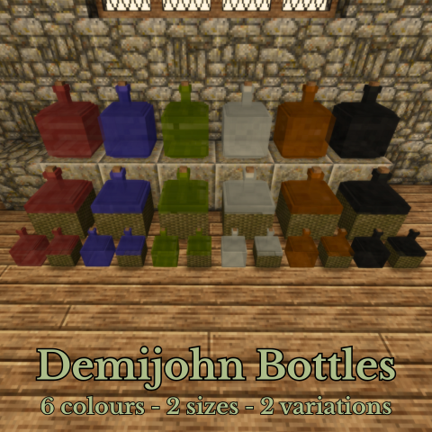 Small demijohns can be placed onto the ground or into tall display cases. They can also be placed on bookshelves if the Shelf Obsessed mod is installed.