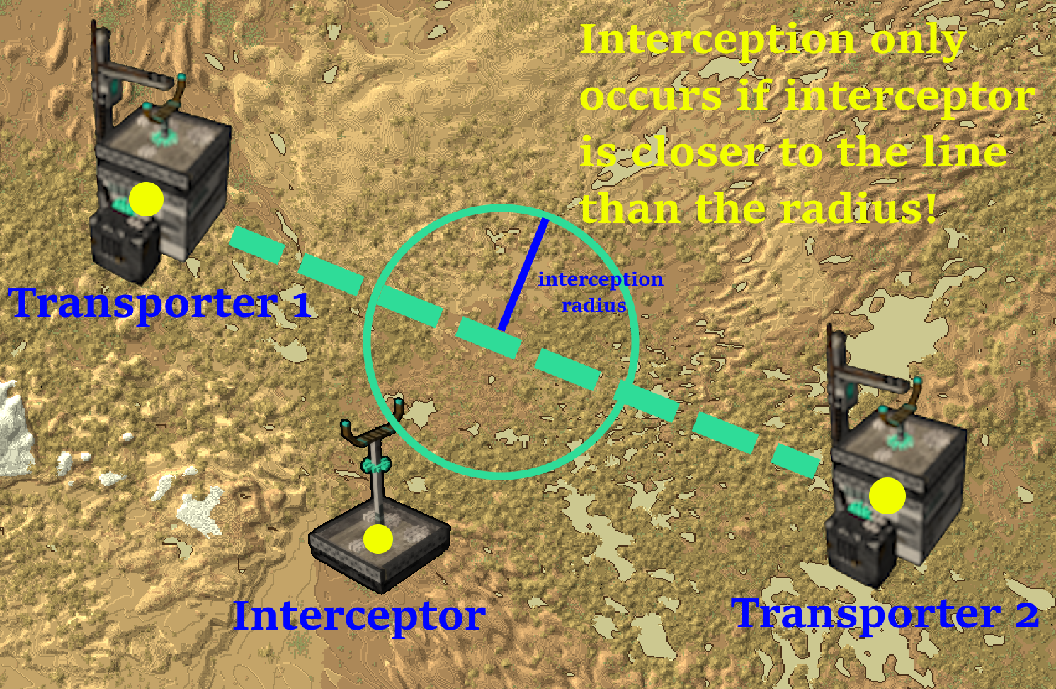 In the example below, interception won't occur because the interceptor has been placed further than the maximum configured distance. Provided that neither transporter is covered, and there are chargers on the sending side, the message would go from Transporter to Transporter.