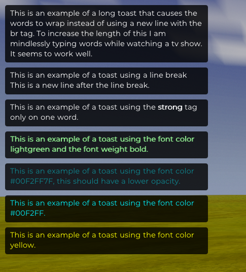 - Moved commands to a new file to clean up code. - Added server-side commands. - Substantial code refactoring. - Added comments within code to assist in understanding how the code works. - Added logic to allow toasts to be called from the server easier. In the past the user would have to implement protobuf in their own mod to send toasts via `ShowToast()`. Now the proper server-side usage would be `toastLib.Server.ShowToast()`. - Removed `FormatLang()` method and the usage of said method. `Lang.Get` already handles this. - Updated README with proper documentation as well as adding the server-side documentation. | |||||||