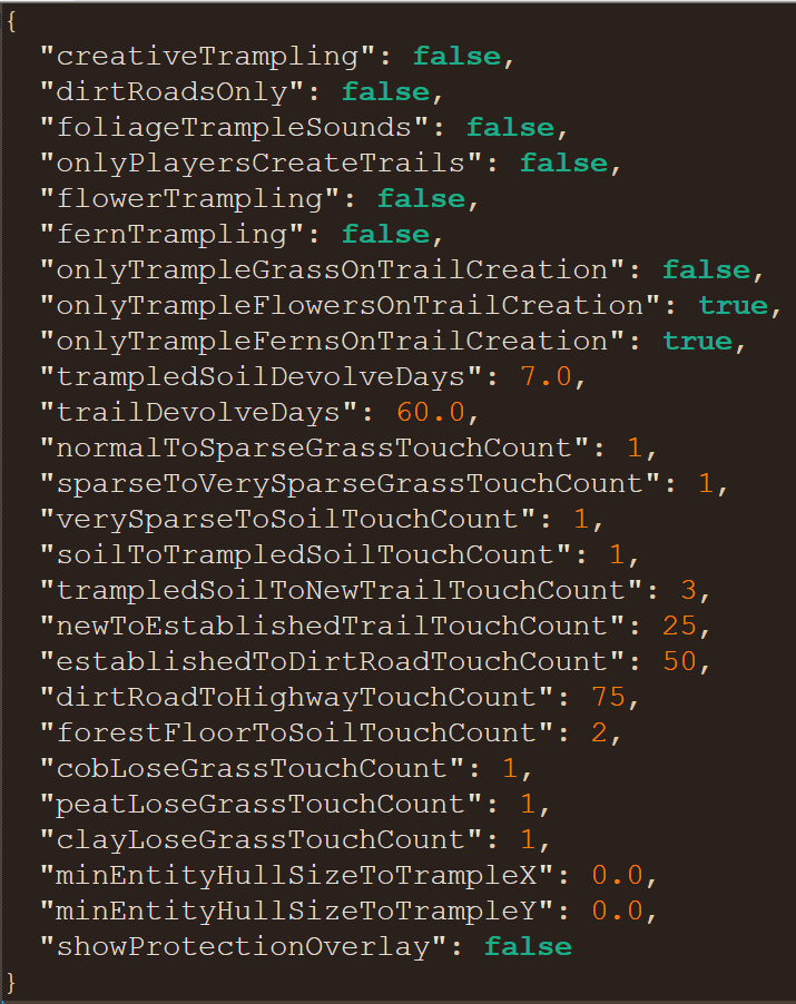 PureWinter I actually made a custom version of the mod for my server that adds mounted trail creation (original code doesn't allow for it). So now on my server you only trample/make trails while you're mounted, which seems to be like a cleaner system than having to protect areas with a trowel. And imo it makes sense realism-wise to not trample your horse all over your crops.