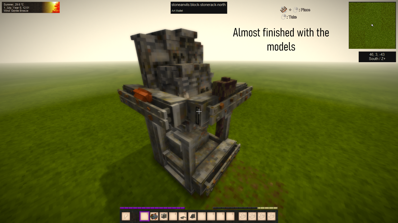 Craft your anvil with the required stone block with any vanilla chisel. Then by placing it back into the grid with any vanilla chisel you can change its texture and model. and for the first time ever only with my mods Knapping/Clayforming on the top of the surface of these anvils can be done , or use for storage. its up to you. This mod is patched for copper cold smithing