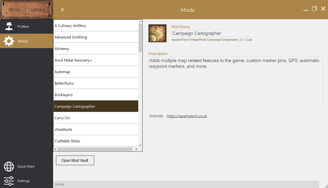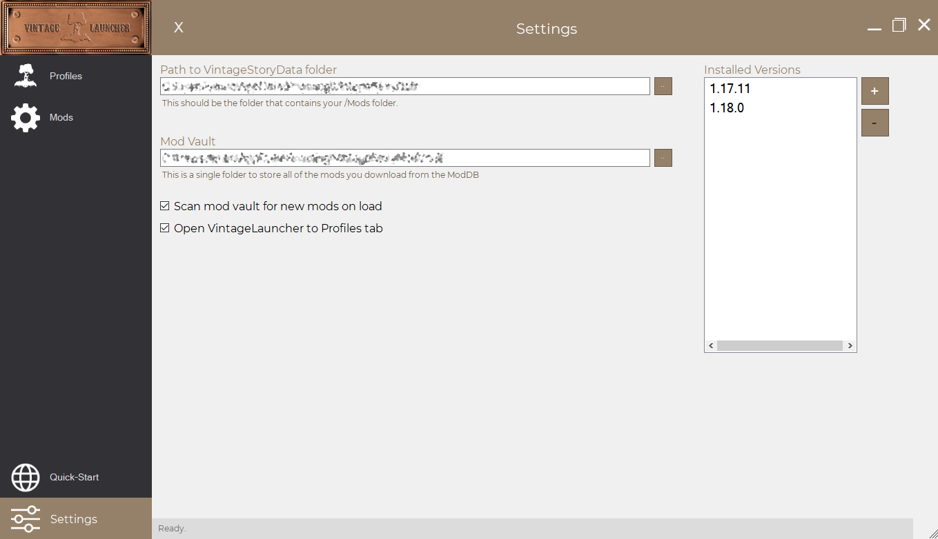 Vintage Launcher is an easy-to-use mod loader that lets you run any configuration of mods and Vintage Story versions.