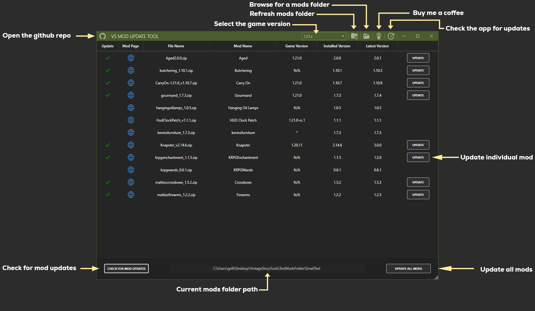 MRGOOSE Make sure you download the latest release which is v0.3.0, it was just updated either slightly before or after your comment. Then when the app opens it will ask you to select your mods folder, this would be the folder you put the mod.zip files. After that just click check for updates and if there are any either click update all mods or click each update button for each mod. If your server isn't on version 1.21.1 (or 1.21.0) at the top right of the app click the dropdown menu and select which game version you need the mods to be and the process to check mods/update is the same every time.