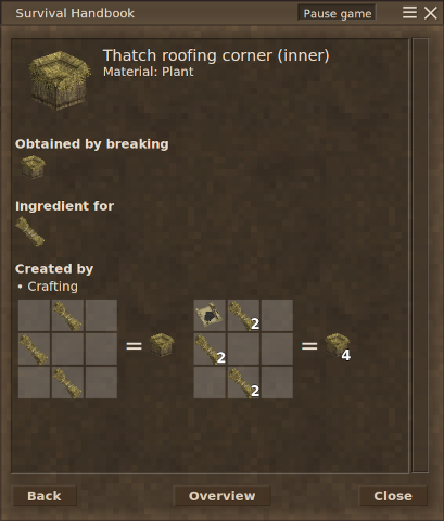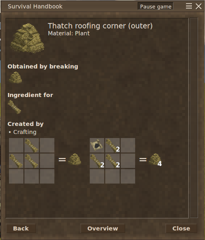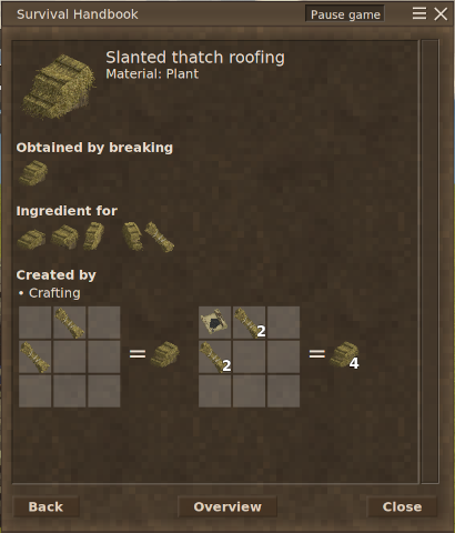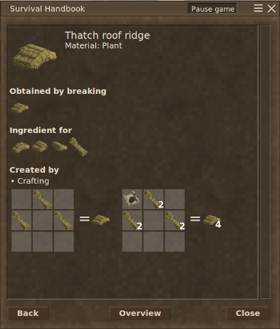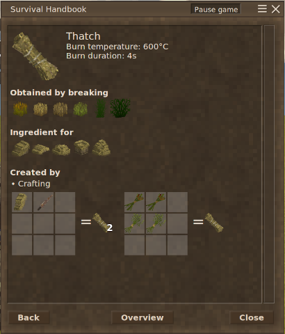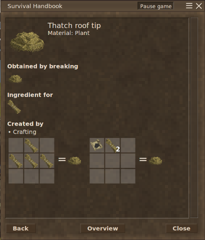 --Cattail tops and papyrus tops can also be used as roofing material, albeit with more wastage. To reflect this they can now be crafted into thatch in the crafting grid at a ratio of 4 tops to 1 thatch. Be warned; once you craft them into thatch you can't change them back!